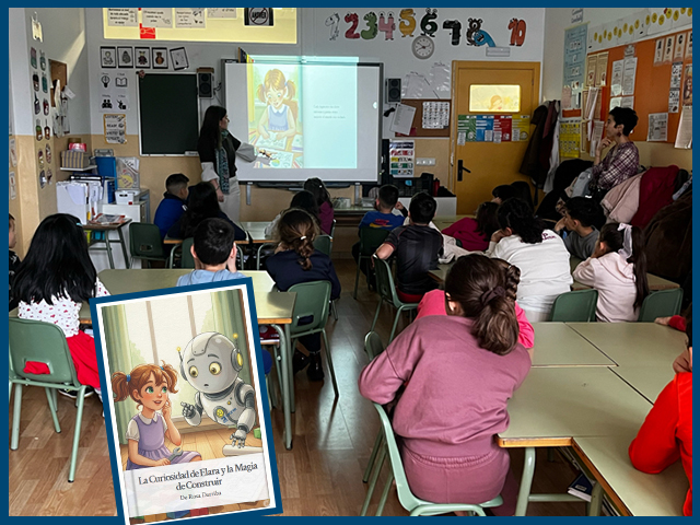 Una de las actividades más destacadas fue la realizada por Rosa Darriba, vocal de la Junta de Gobierno del COGITIM, en el Colegio Juan de Valdés. Darriba leyó a todas las clases de segundo de Primaria su cuento “La curiosidad de Elara y la magia de construir”, una historia pensada para despertar la curiosidad y acercar la ingeniería de manera lúdica, amena y participativa.